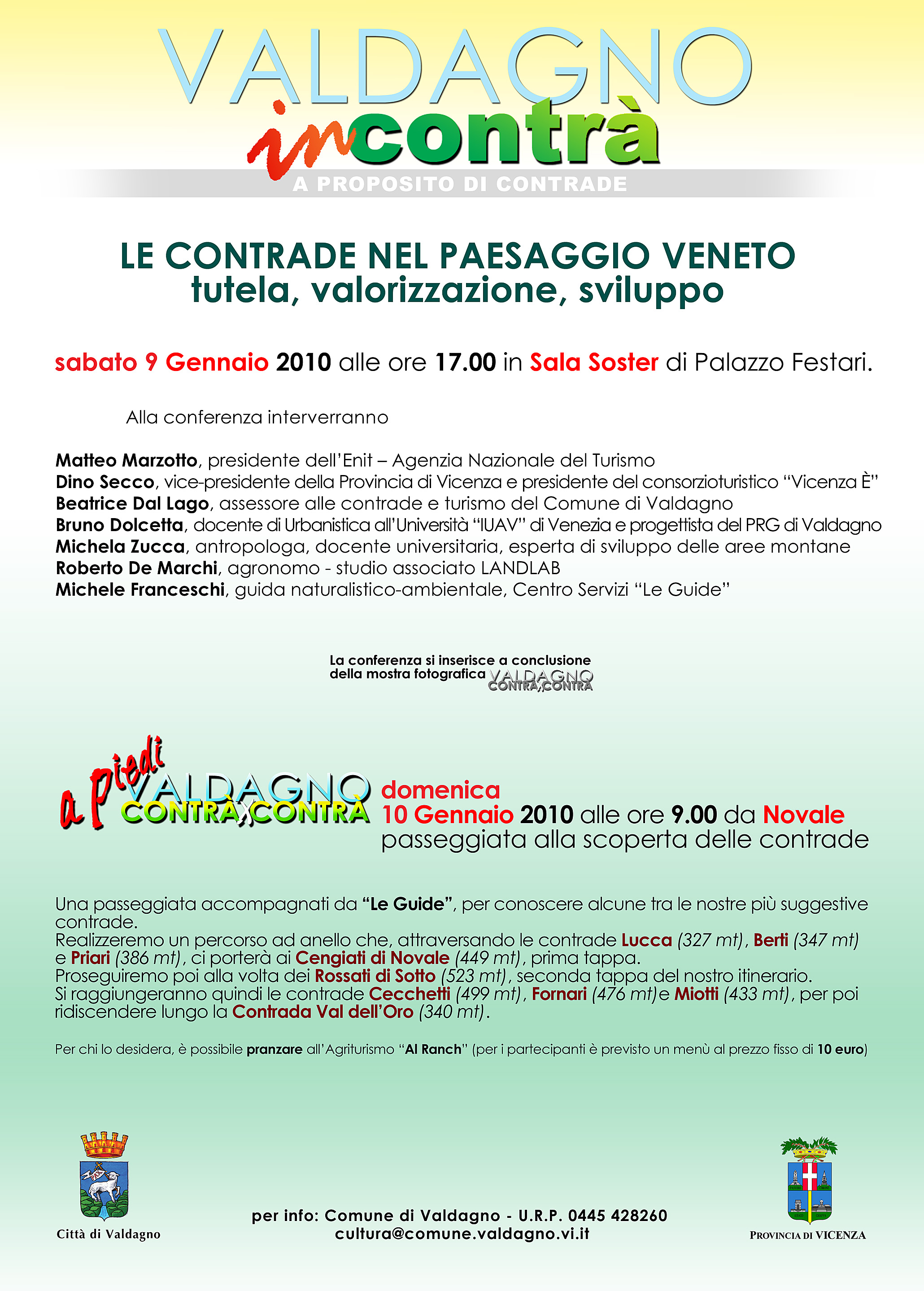 Il 9 gennaio 2010 (ore 17.00, Sala Soster di Palazzo Festari) si svolgerà a Valdagno un’importante conferenza pubblica, dal titolo “Le contrade nel paesaggio veneto: tutela, valorizzazione, sviluppo”, che avrà come protagonista il modello residenziale-sociale delle cosiddette “contrade”.